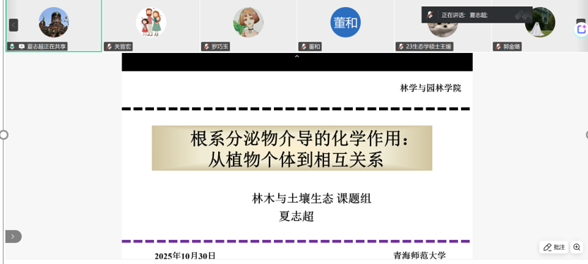 夏志超教授围绕根系分泌物这一主题,系统解析了其在植物个体生理调节、种间相互作用中的化学介导机制,并结合人工林培育的研究实践,阐述了根系分泌物在森林生态系统中的功能价值与应用前景。在交流环节,与会师生就根系分泌物的检测技术、高寒地区植物的化感作用等问题与夏教授展开探讨,现场学术氛围浓厚。