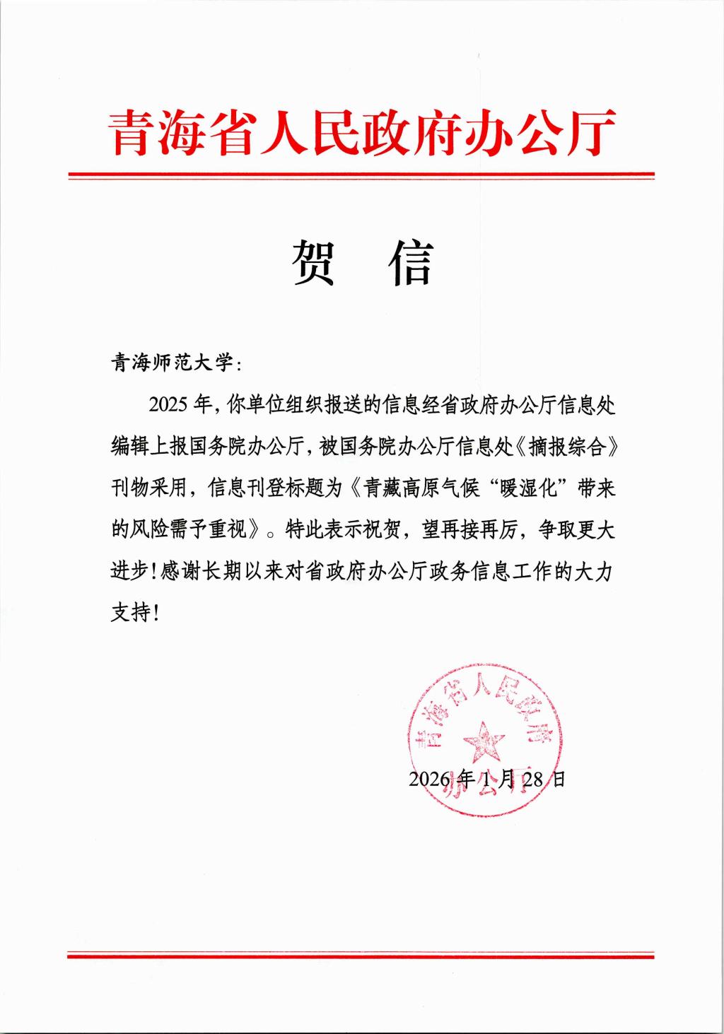 组织报送的信息经省政府办公厅信息处编辑,上报国务院办公厅,被国务院办公厅信息处《摘报综合》刊物采用,信息刊登标题为《青藏高原气候“暖湿化”带来的风险需予重视》。
